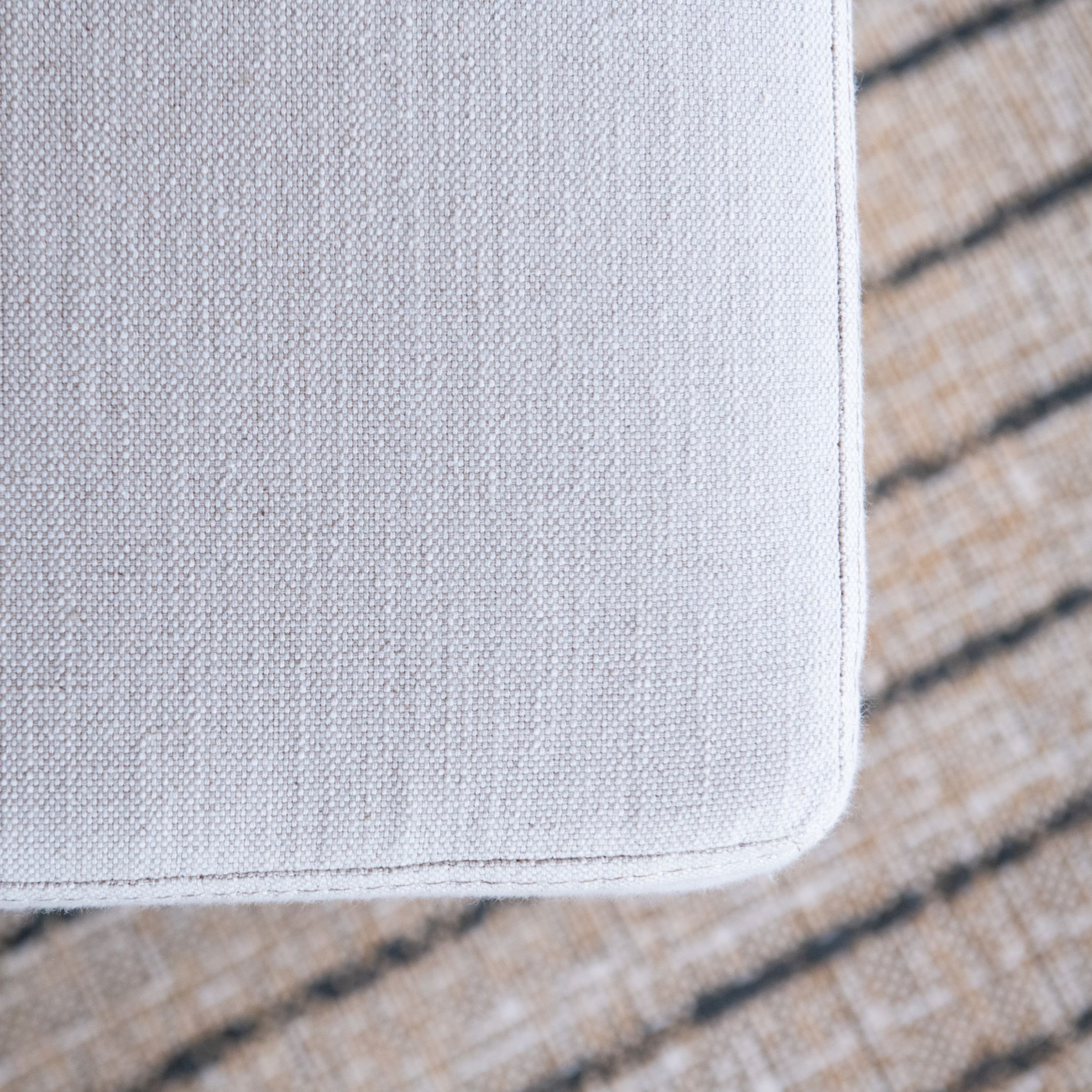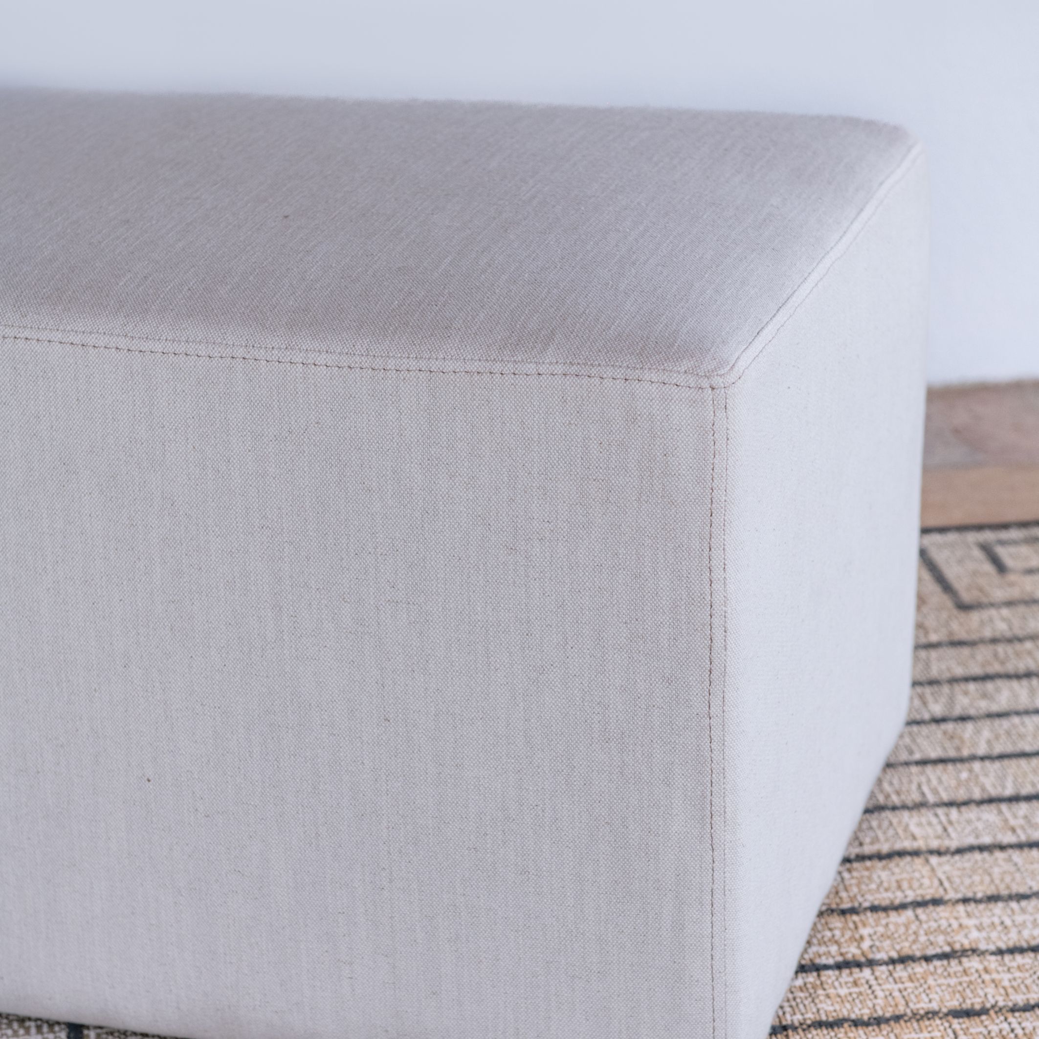 Boxed ottoman upholstered in natural linen. For flexibility also available in beautifully fitted loose covers.