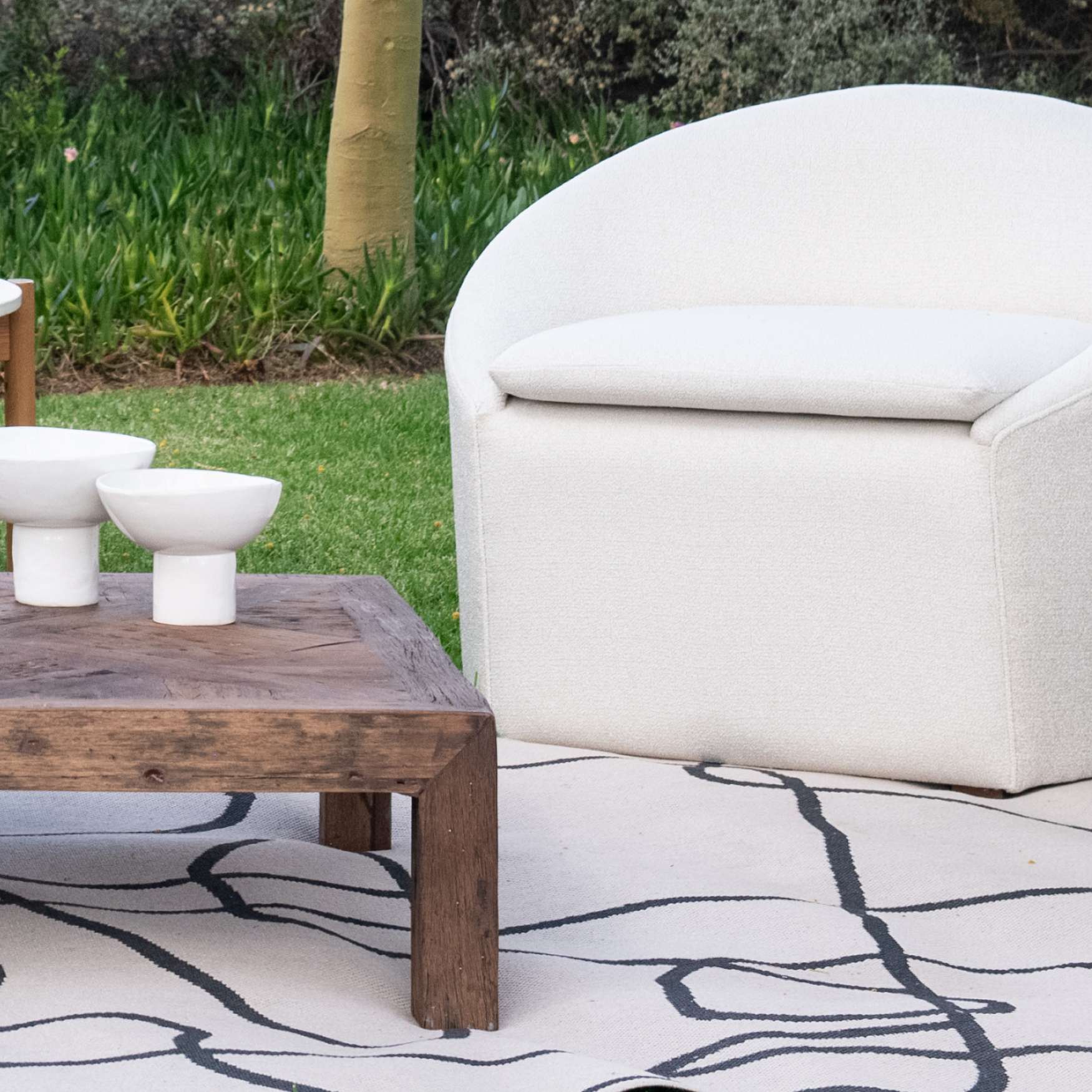 Fully outdoor polypropylene rug with swirl pattern.